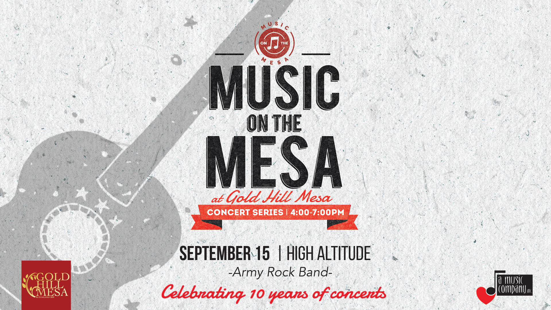 The 10th annual Music on the Mesa concerts in the park are the second Saturday of June, July, and August AND every Saturday September 1-September 22 from 4:00-7:00pm.